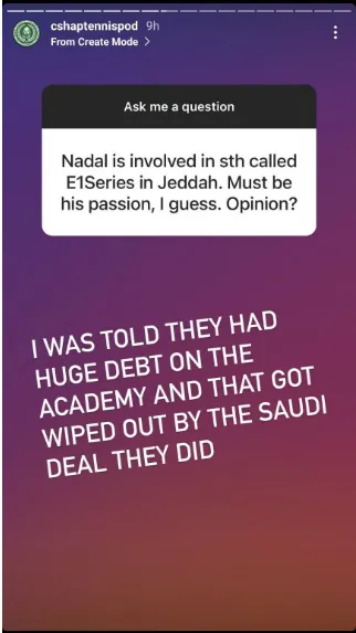 Rafael Nadal se tornaria embaixador de ténis da Federação Saudita de Ténis, o comentador de ténis Craig Shapiro afirmou que a mudança beneficiava a Academia de Ténis do espanhol, que tem vindo a acumular uma dívida substancial.