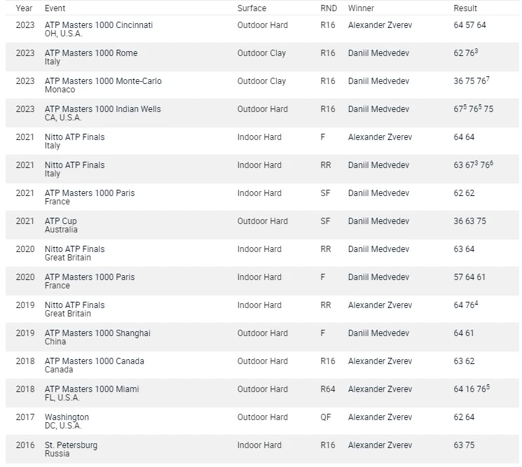 O seu último encontro após os oitavos de final viu Zverev vencer a final do ATP Finals de 2021. Mas o seu primeiro encontro remonta a 2016 na Rússia, que viu Zverev vencer.