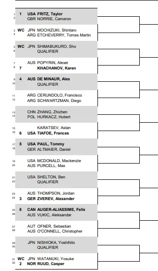 Casper Ruud também está entre os cabeças-de-série, tal como Alexander Zverev, que poderá enfrentar Ben Shelton na segunda ronda. Frances Tiafoe também começa contra Aslan Karatsev.