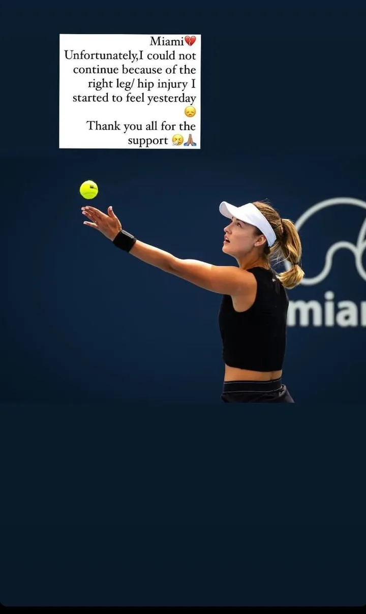Open de Miami de 2024, inicialmente invocando problemas de saúde. Mas a jogadora de 25 anos revelou que tem uma lesão na coxa direita.