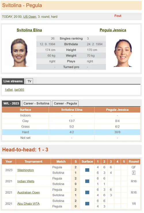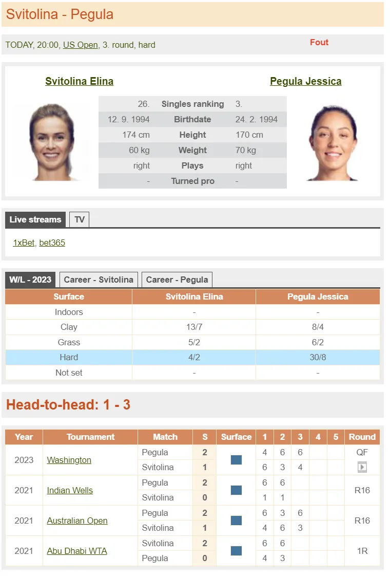 Também se defrontaram recentemente, com Pegula a vencer em três sets no recente Citi Open Washington. Será provavelmente uma batalha renhida, de qualquer forma, mas Pegula será favorita à vitória.