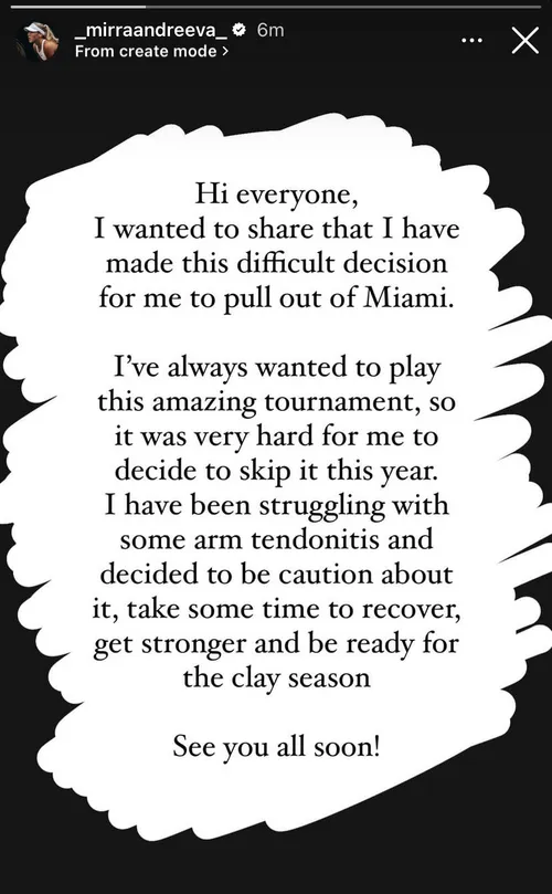 Na sua história no Instagram, Andreeva escreveu que tem estado a sofrer de tendinite no braço. Ela disse que decidiu ser cautelosa e não arriscar antes da temporada de terra batida.