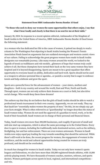 "Como mulher que dedicou a sua vida à causa das mulheres, foi com profunda dor que li uma coluna no The Washington Post que se opõe a que a Arábia Saudita acolha as Finais da Associação de Ténis Feminino com base em argumentos que são estereótipos ultrapassados e visões ocidentais da nossa cultura", lê-se na declaração nas redes sociais.