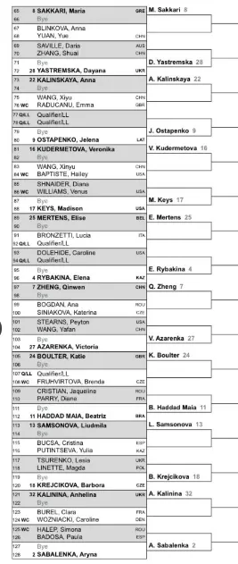 Coco Gauff, no seu estado natal, vai enfrentar Ashlyn Krueger ou uma qualifier/Lucky Loser. A grande novidade é a segunda cabeça de série, Aryna Sabalenka. Ela enfrentará Simona Halep ou Paula Badosa com o primeiro definido para seu retorno pela primeira vez desde o US Open de 2022, após ser banido por testar positivo para a substância Roxudustat. A proibição inicial de quatro anos foi reduzida para nove meses, pelo que pode regressar de imediato e recebeu um wildcard do diretor do torneio, James Blake.